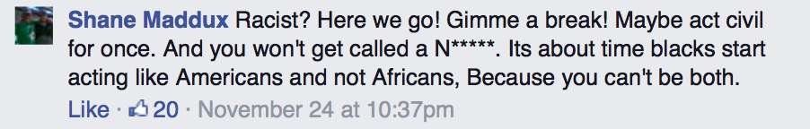 Screen Shot 2014-11-26 at 2.49.03 AMAnd what’s really amazing to me is how many of the people writing these death wishes and outlandishly racist comments on a public Facebook page had, right next to their name and picture, a link to the Facebook page of their place of employment. Maybe, as you’re reading some of the hate-filled comments that people write on Facebook, you should take a screen capture of the comments and post that picture on their employer’s Facebook page…. Just to make sure that the people who sign their paychecks know how they really feel. If you’re using a Mac, you can do this by pushing Shift-Comamand-4…. Just in case.