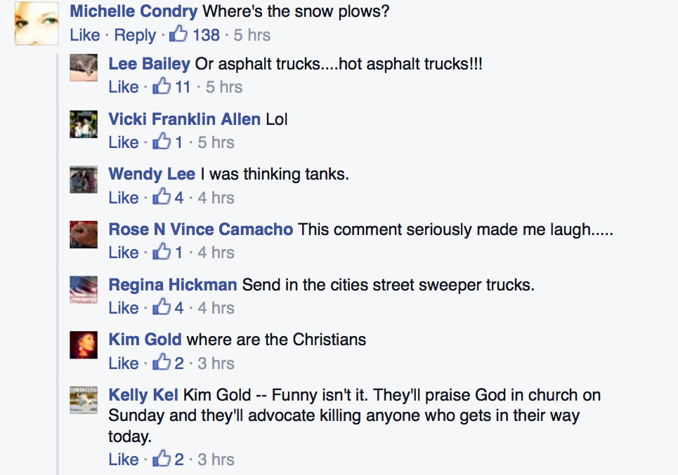 Tonight in Nashville, about 450 people marched through the downtown streets in a show of solidarity with the protesters in Ferguson, Missouri. During their peaceful protest, they laid down in the middle of the interstate for 4 1/2 minutes, representing the number of hours that Michael Brown’s body laid in the street after he was killed. After the protest, some of Nashville’s police officers offered the protesters hot chocolate (which I think is absolutely awesome and an actual example of “peacekeeping”). When WKRN posted a picture on their Facebook page of the people lying on Interstate 24, here are some of the highlights of the comments that followed: