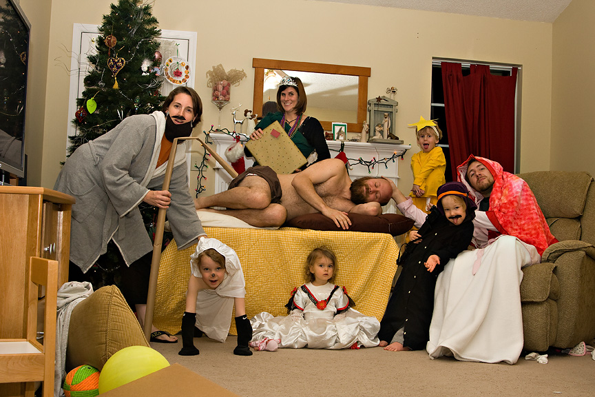 Well, it’s not really a game, I guess. Most games have losers, and in this “game” everyone wins. It’s really more of an activity. And it doesn’t really have a name. Nativity Roulette? That sounds too dangerous. Nactivity? Nope. That’s dumb. Quasi-Sacriligious Dress-Up? Nah, then you’ll lose a bunch of the more conservative members of your family, and that’s no fun…. Let’s just stay with “The Nativity Game.” Here is how it works: