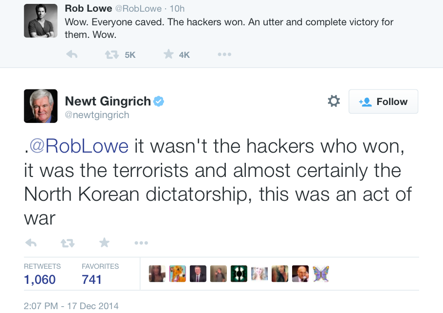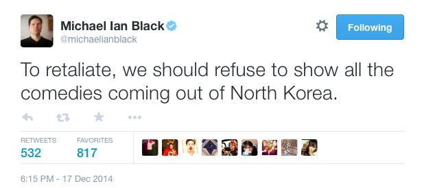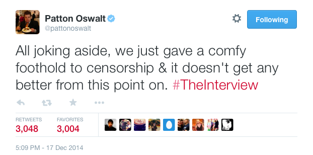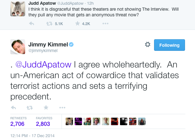I’m not completely convinced that the theaters were reacting to the threat from NK or to the fact that the movie is lame and now everyone knows how it ends.