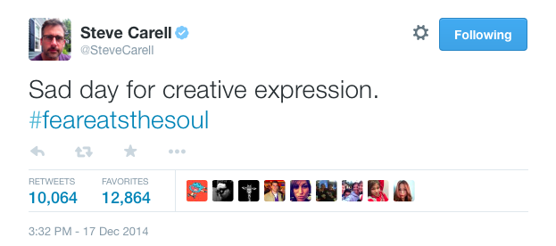 “Fear eats the soul.” How true is that…. He knows what he’s talking about. Incidentally,  Steve Carell was set to star in a thriller set in North Korea, but on Wednesday New Regency cancelled plans for that movie. Even Newt Gingrich understood what a messed up thing just happened: