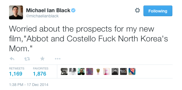 So really, this is about precedent. If we (the people) react in anger to the pulling of this film (which before all this hubbub I had about a zero percent chance of going to see, but now would go pay to see out of principle), the next time something like this happens, maybe things might work out differently. Some people are pointing their finger at Sony and calling them cowards, but before Sony there were the theaters, and the theaters’ decision was really just a business decision that is a reflection of our own cowardice. If they thought all this hype would actually put butts in the seats, they would have wallpapered the walls with “The Interview” advertisements….