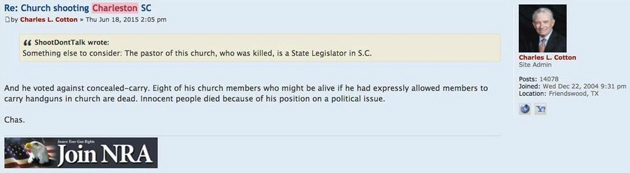 And then, the cherry on the poop sundae that was today turned out to be reading about how a man named Charles Cotton (perfect) who is a board member of the NRA, posted in a pro-gun forum and said that Senator Pinckney’s death (and the death’s of those eight other men and women) were his own fault. His comment has since been taken down, but he wrote that Pinckney “voted against concealed-carry. Eight of his church members who might be alive if he had expressly allowed members to carry handguns in church are dead. Innocent people died because of his position on a political issue.” You can see a screen capture of his comment below….