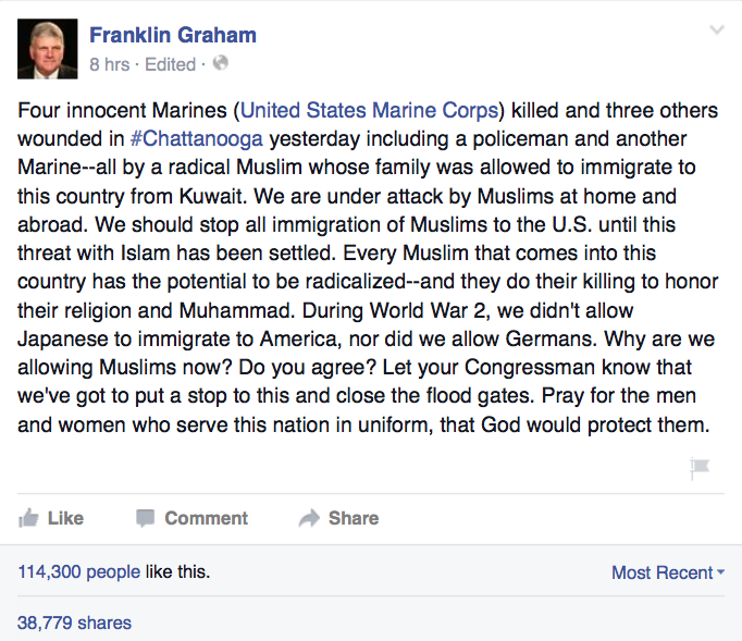 On Thursday, four marines in Chattanooga were killed by a man named Muhammad Youssuf Abdulazeez. Now, there are basically two different types of people right now: 1) There are the kinds who hear this shooter’s name and think, “It figures.” And 2) There are the kinds who hear this shooter’s name and think, “Well crap….” Certainly, if you are a person living in America whose name sounds any sort of Muslim, you probably belong to the second group…. But there are a lot of people like me out there too–People whose names and physical features and culture has nothing Muslim about them. Unfortunately, there are a whole lot of people in the first group as well. People like Franklin Graham, who posted this steaming load of garbage on his Facebook page:
