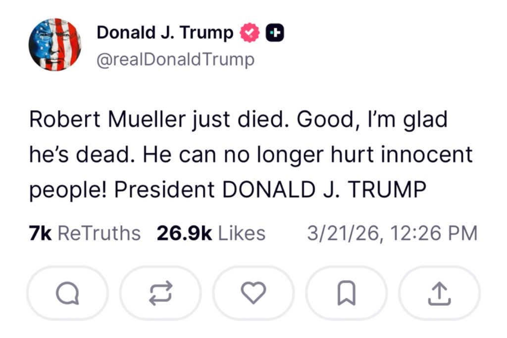 After the war, he got his JD from the University of Virginia School of Law. Over the years, he spent some time working for private firm, but spent most of his time in public service, rising through the ranks of the United States Attorney’s Office and the Department of Justice. In 2001, George W. Bush nominated him as FBI Director, and he was voted in 98-0. Mueller was a lifelong republican, but he was so well-respected that Barack Obama asked him to continue as Director. He also served under presidents George H. W. Bush and Bill Clinton. In 2004, when members of Bush’s White House tried to push through warrantless wiretapping that the Department of Justice had ruled as unconstitutional, Mueller (along with John Ashcroft and James Comey) threatened to resign in protest. Everyone in government KNEW Robert Mueller had earned his reputation for honesty & integrity, so when they needed an independent council to investigate Russian interference in the 2016 election, Mueller was the obvious choice for Deputy Attorney General Rod Rosenstein (who trümp had nominated after he fired James Comey as Attorney General in trümp’s continued purge of all government employees who had a shred of courage, character, or integrity). By the end of the investigation, many of trümp’s allies and campaign staff had been charged with crimes and lying in their testimonies. Even though Bill Barr said the Mueller Report exonerated trümp, Mueller himself said, “while this report does not conclude that the President committed a crime, it also does not exonerate him.” Though the report made it clear that trümp had committed obstruction of justice, Mueller said, “under long-standing Department policy, a president cannot be charged with a crime while he is in office.” Trümp went from calling the Report a “total exoneration” to calling it “total bullshit.” And this is the meat of the never-healing injury to trümp’s fragile little narcissistic void-in-his-chest-where-a-heart-should-be that led him to celebrate the death of yet another American Hero.